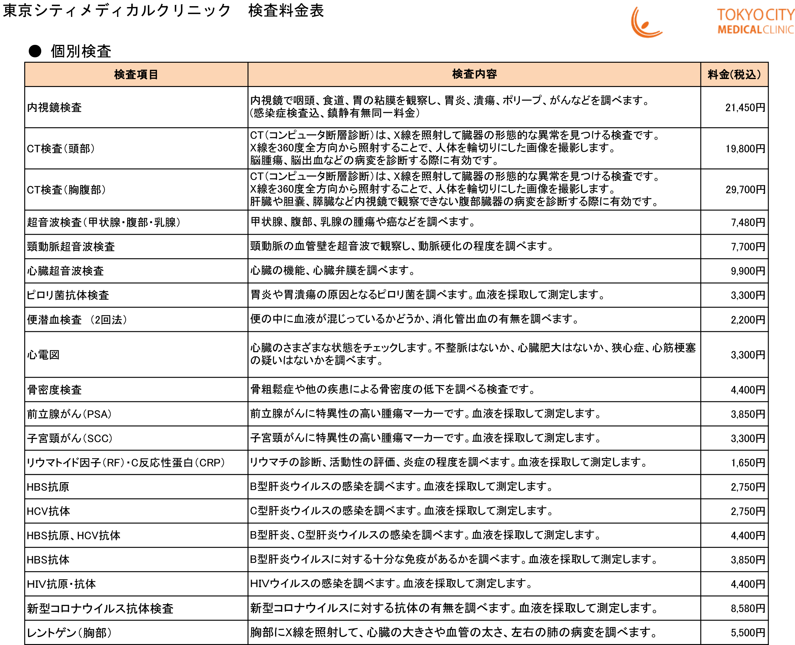 検査料金表(個別)