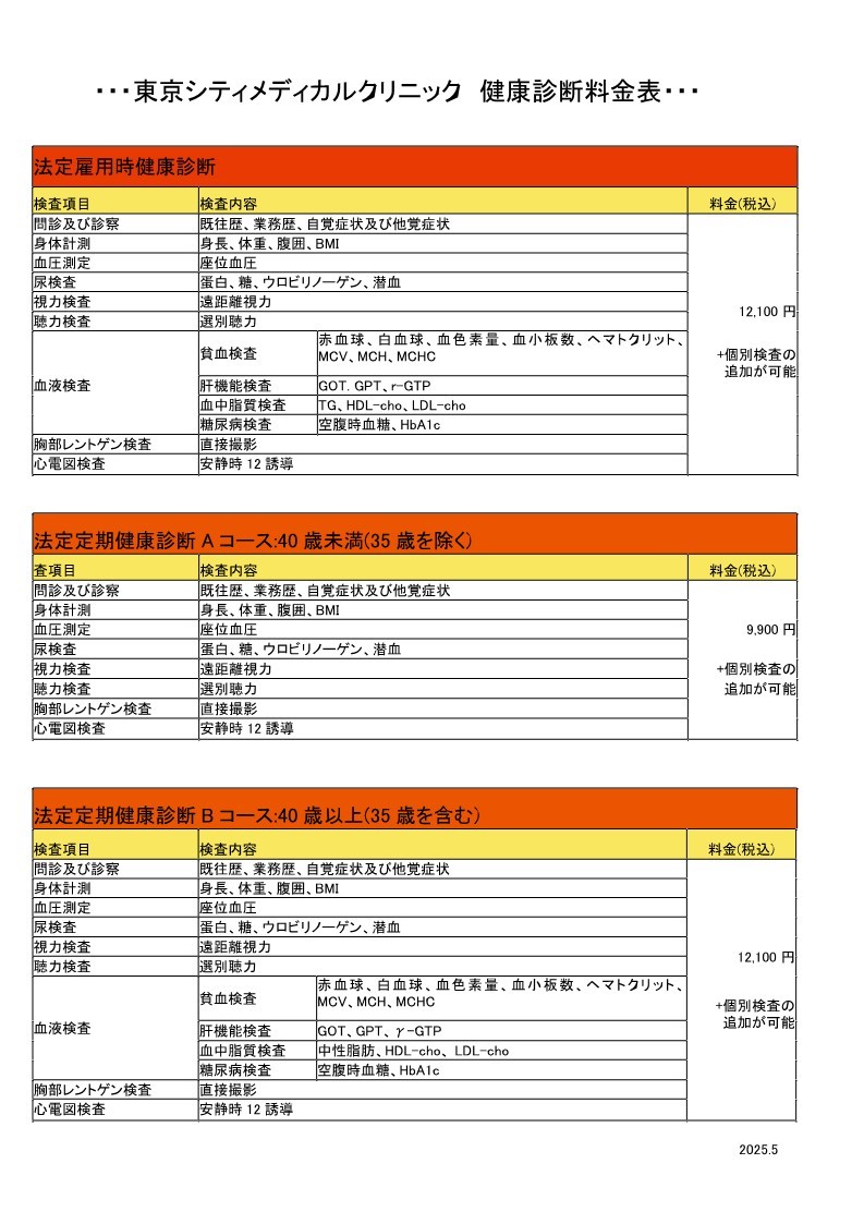 当クリニックでは、身長・体重、聴力、視力などの測定からレントゲン、CT撮影まで、いろいろな組み合わせで健康診断を受診していただけます。また、企業入社時検診や施設入所の感染症診断なども承っています。予約が必要となりますので、健康診断をご希望の方は、まずはお電話(03-5623-2888)でご相談下さい。また現在、病気ではないけれども、ご自身の健康に不安をお持ちの方(家族歴がある方など)には血液検査等を適切に組み合わせて検査いたします。(自費診療となります)普段、健康診断をされていない方にぜひお勧めいたします。予約は必要ありませんので、お気軽にお声がけください。